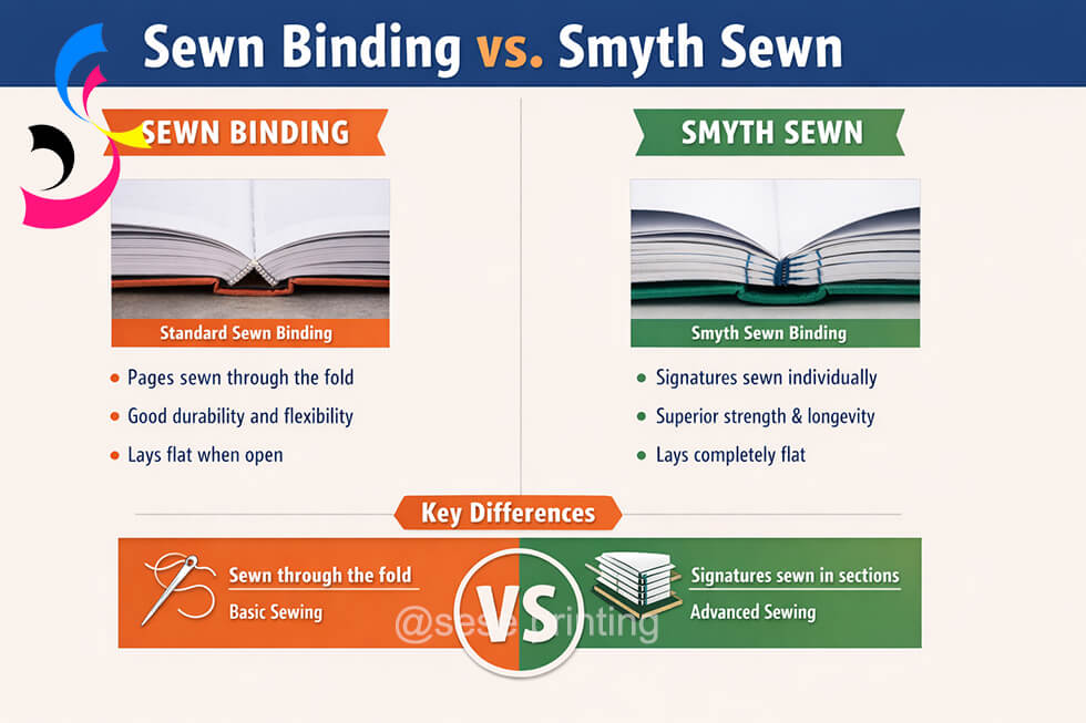 Smyth sewn is a specific type of sewn binding that is particularly known for its durability and quality. In Smyth sewing, the book’s signatures are stitched through the fold, creating a robust and flexible binding. This method not only strengthens the book but also allows it to lay flat when opened—ideal for books that require extensive handling, like photo books, art books, and manuals.