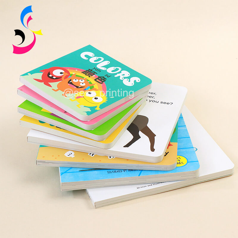 Board books often feature rounded corners for safety and vibrant colors for visual appeal. Customization options like interactive elements (flaps, textures) and durable coatings make board books an excellent choice for educational or interactive children's books.