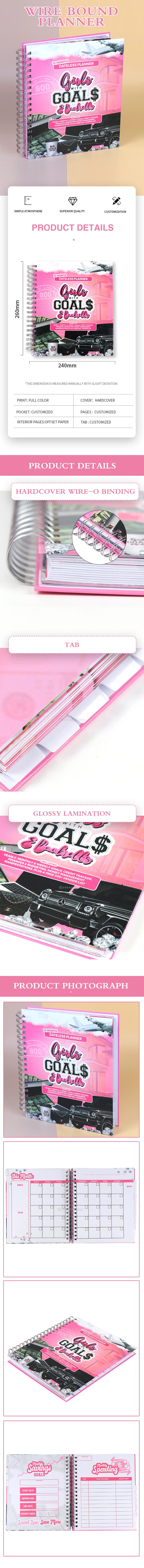 We can custom wire-o planner, spiral planner, leather planner, goals planner, hardcover planner and fabric planner.